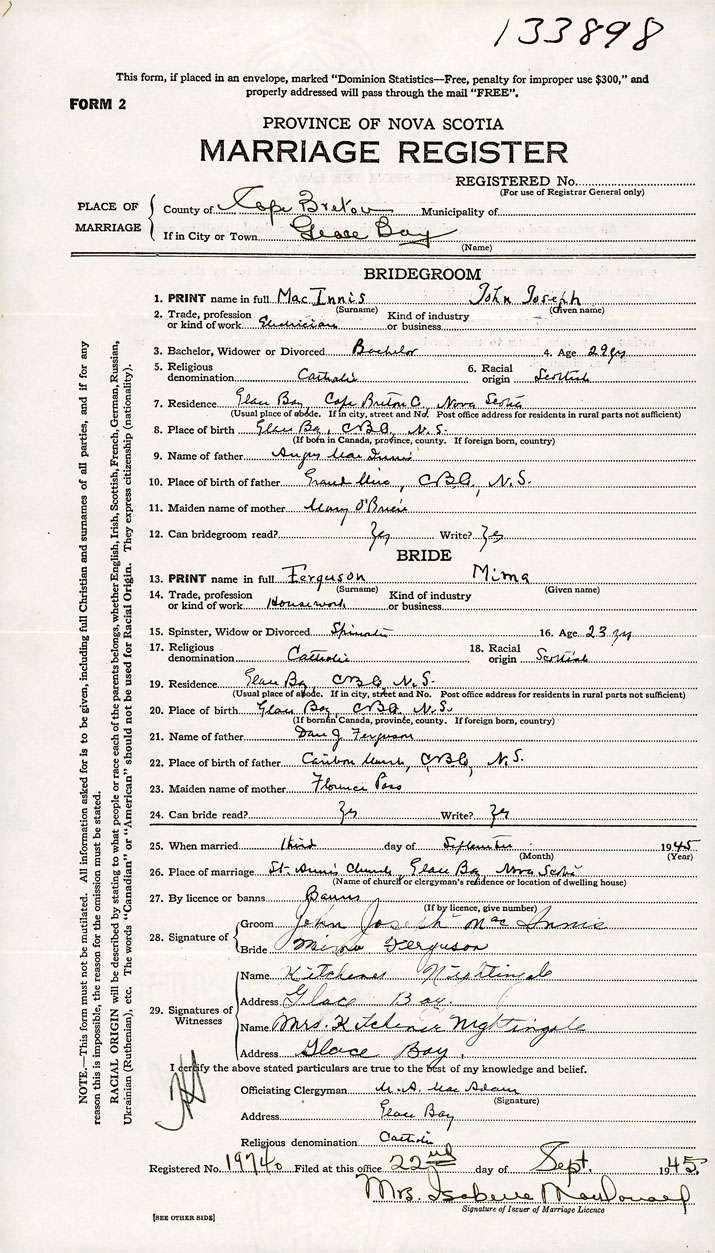 PLACE OF MARRIAGE County of Cape Breton in City or Town Glace Bay
