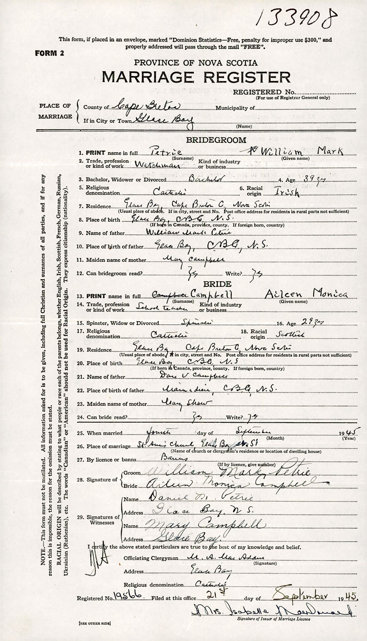 PLACE OF MARRIAGE County of Cape Breton in City or Town Glace Bay