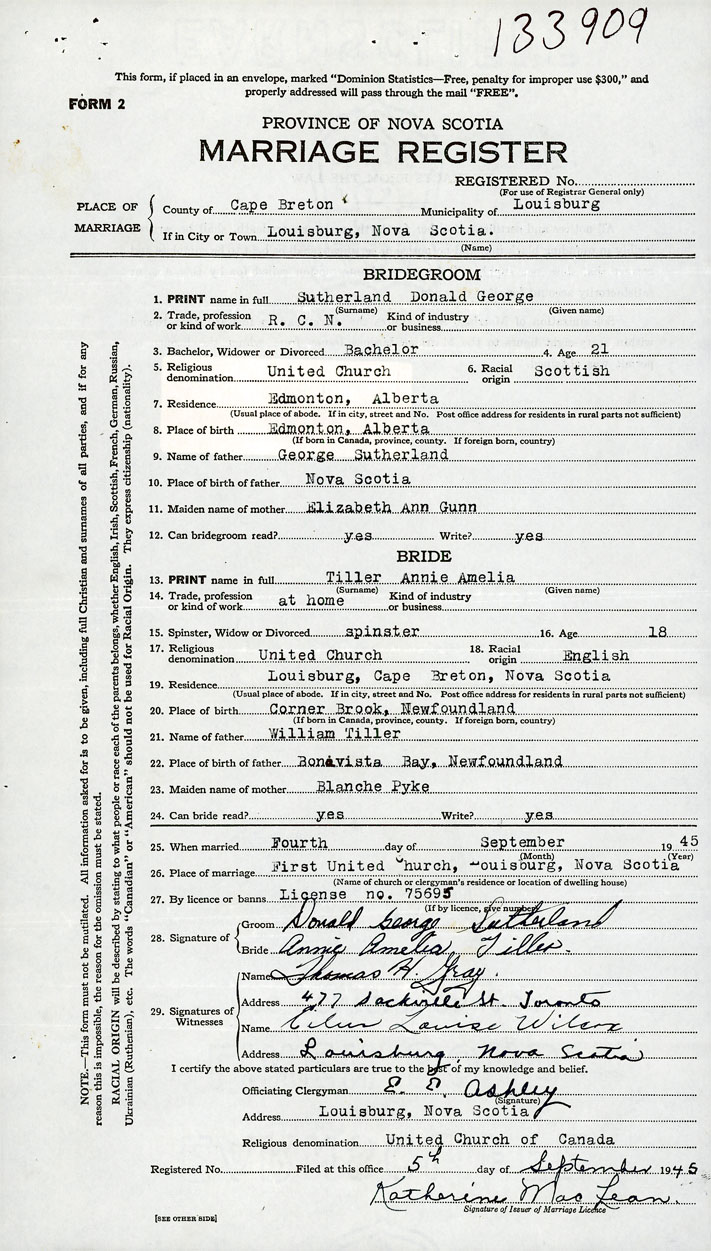 26. Place of marriage First United Church Louisbourg, Cape Breton County
