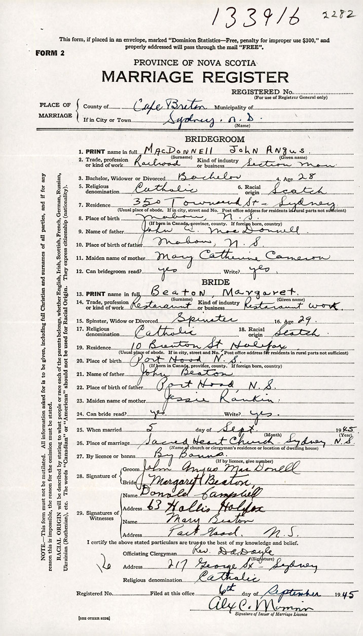 PLACE OF MARRIAGE County of Cape Breton in City or Town Sydney