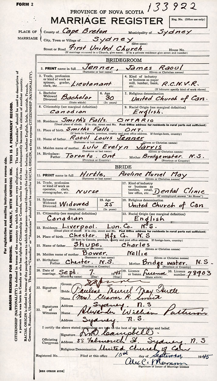 26. Place of marriage First United Church Sydney, Cape Breton County