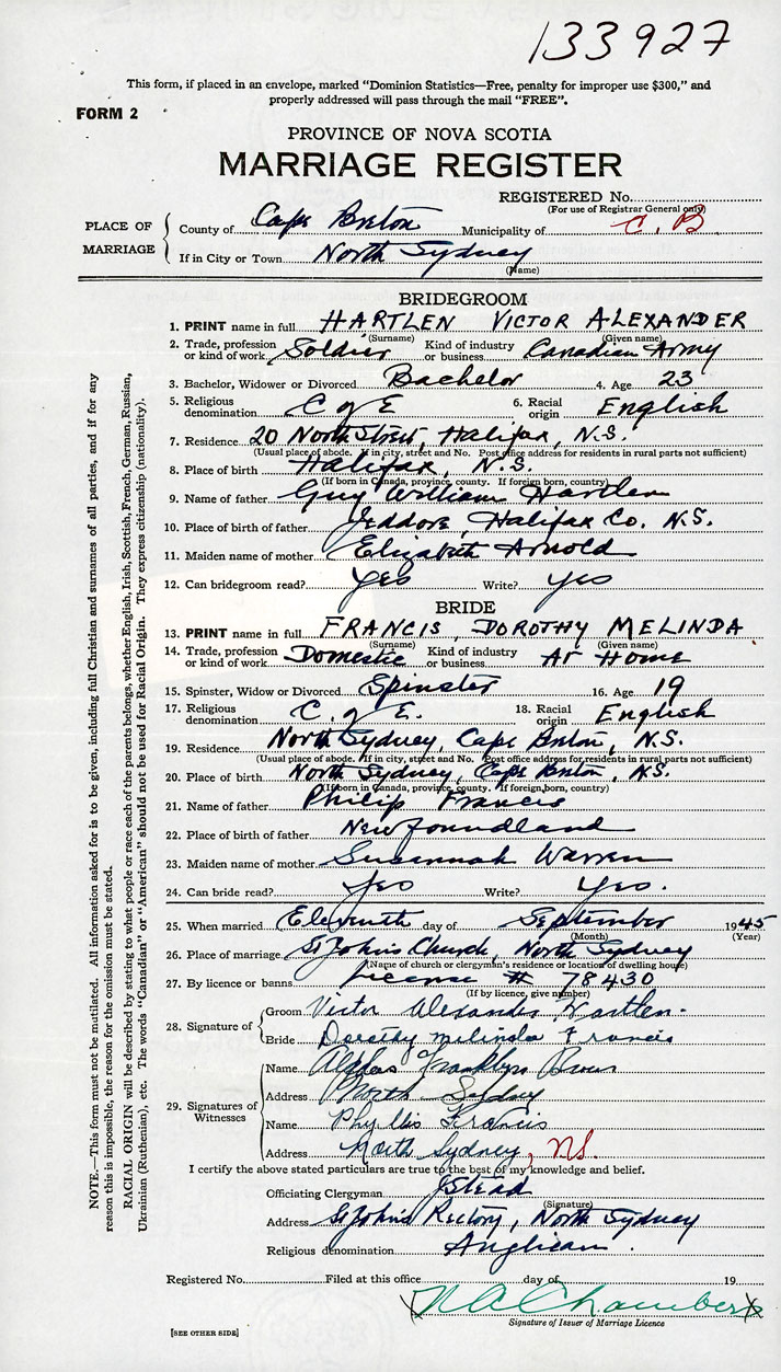 26. Place of marriage St. John's Church North Syndey, Cape Breton County
