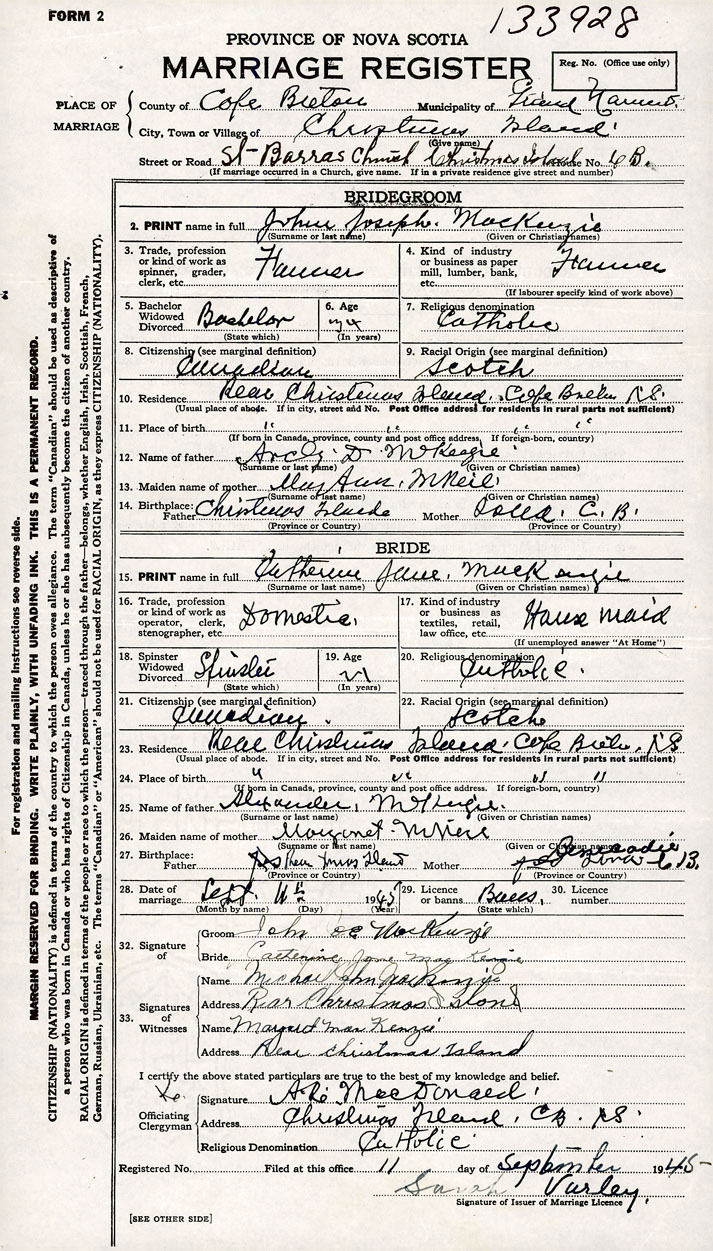 PLACE OF MARRIAGE County of Cape Breton in City or Town Christmas Island