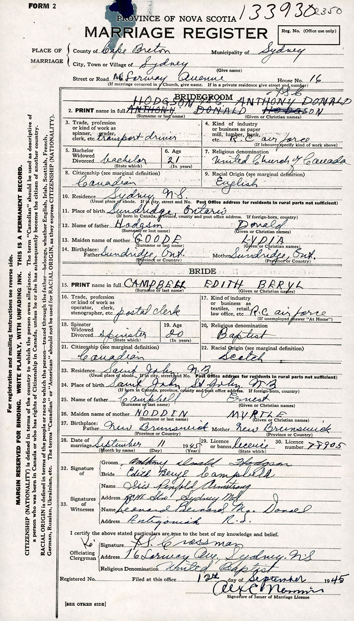 26. Place of marriage 16 Farway Avenue Sydney, Cape Breton County