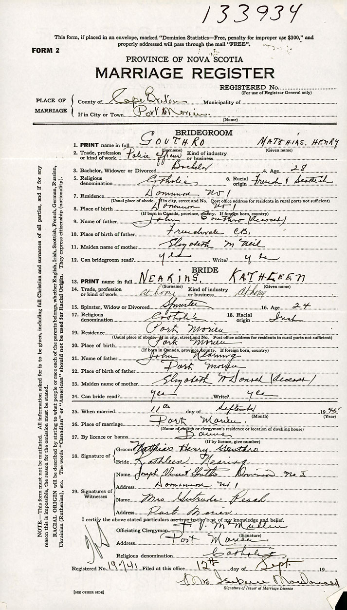 PLACE OF MARRIAGE County of Cape Breton in City or Town Port Morien