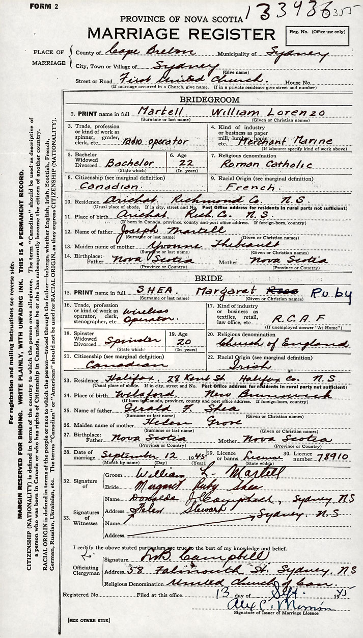 26. Place of marriage 58 Falmouth Street Sydney, Cape Breton County