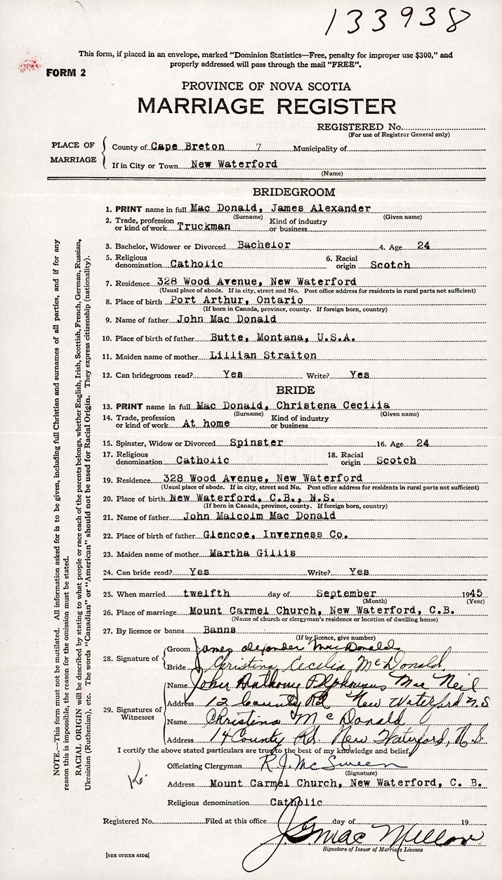 PLACE OF MARRIAGE County of Cape Breton in City or Town New Waterford