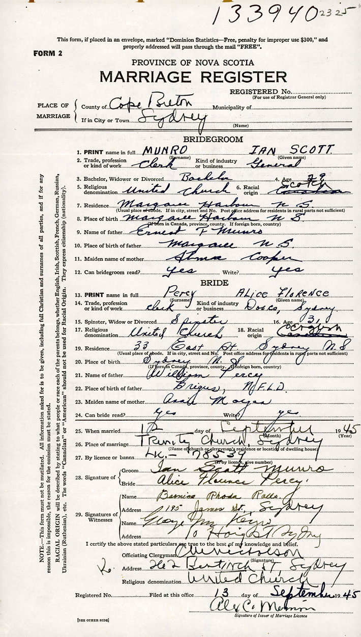 PLACE OF MARRIAGE County of Cape Breton in City or Town Sydney