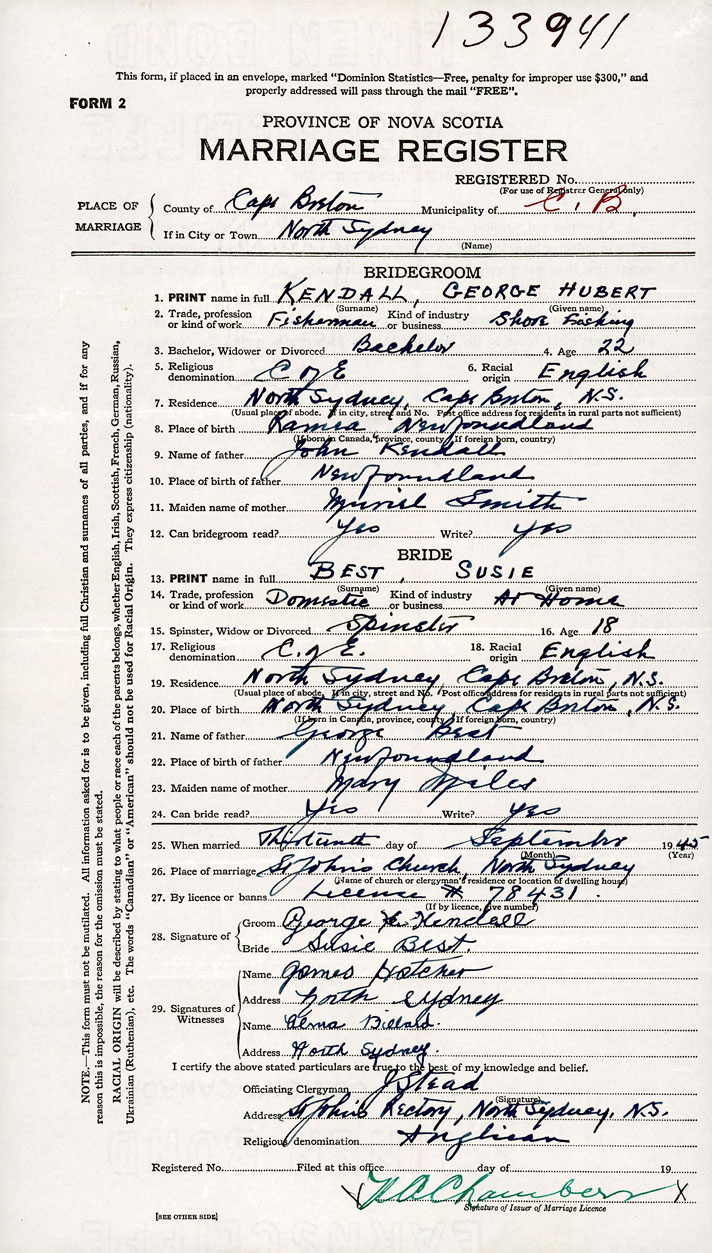 26. Place of marriage St John's Church North Sydney, Cape Breton County