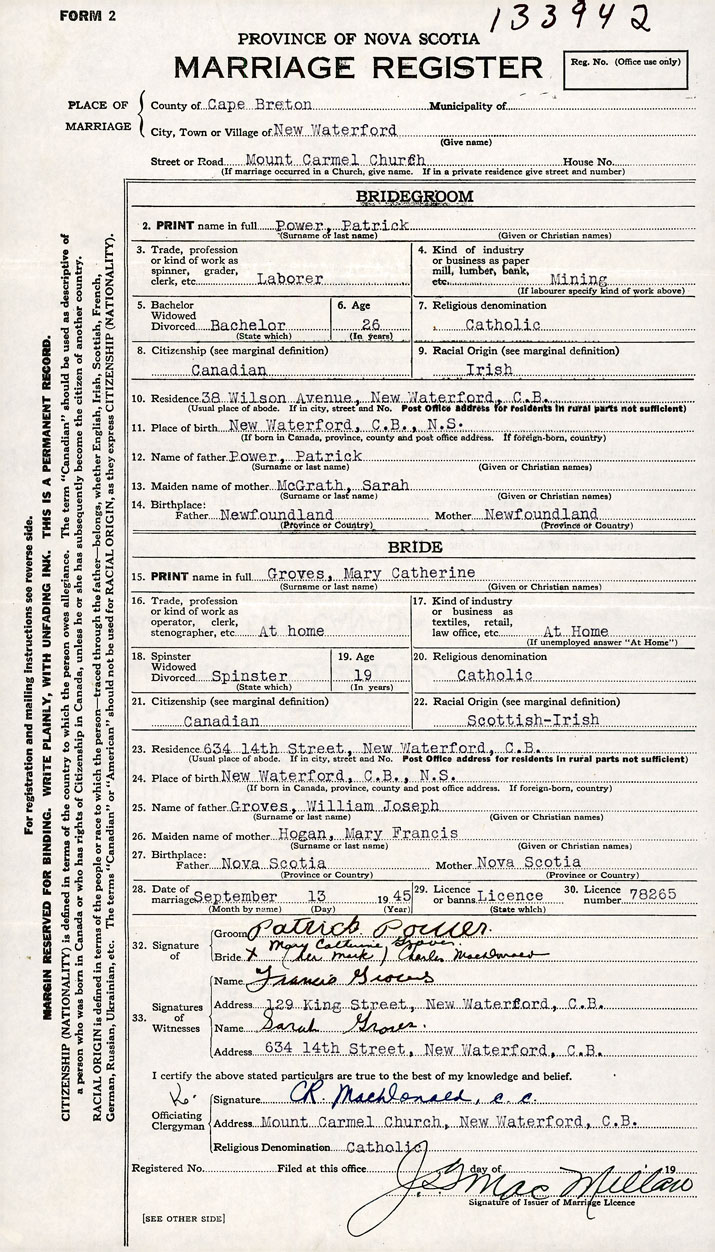 26. Place of marriage Mount Carmel Church New Waterford , Cape Breton County