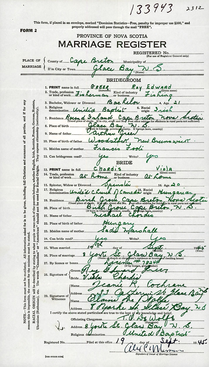 PLACE OF MARRIAGE County of Cape Breton in City or Town Glace Bay