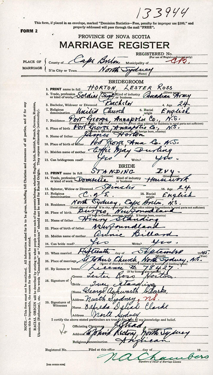 26. Place of marriage St. John's Church North Sydney, Cape Breton County