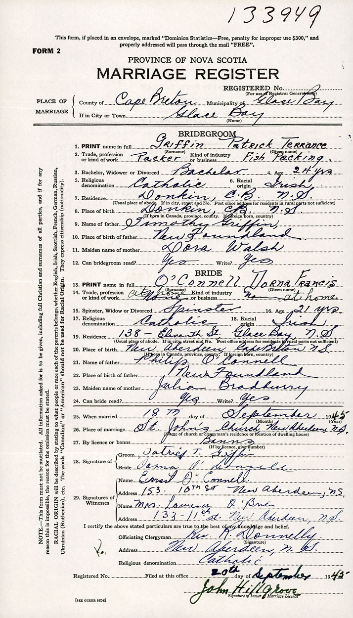 PLACE OF MARRIAGE County of Cape Breton in City or Town New Aberdeen, Glace Bay