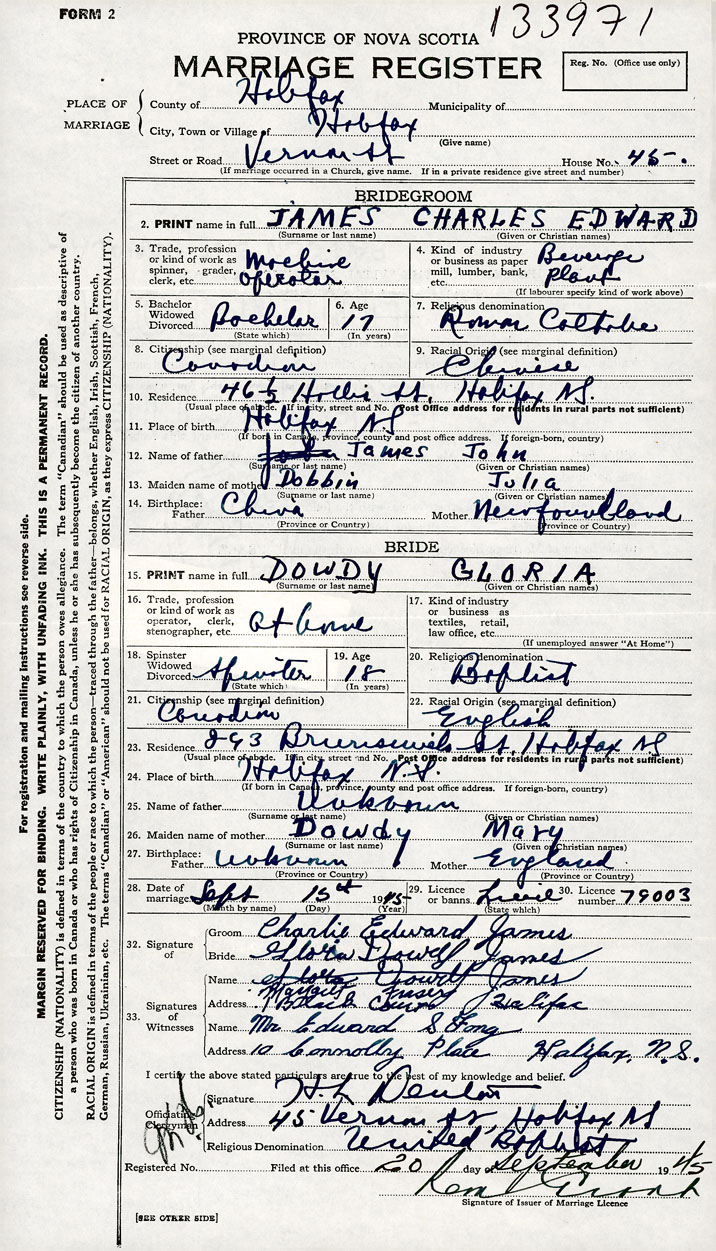 26. Place of marriage 45 Vernon Street Halifax, Halifax County