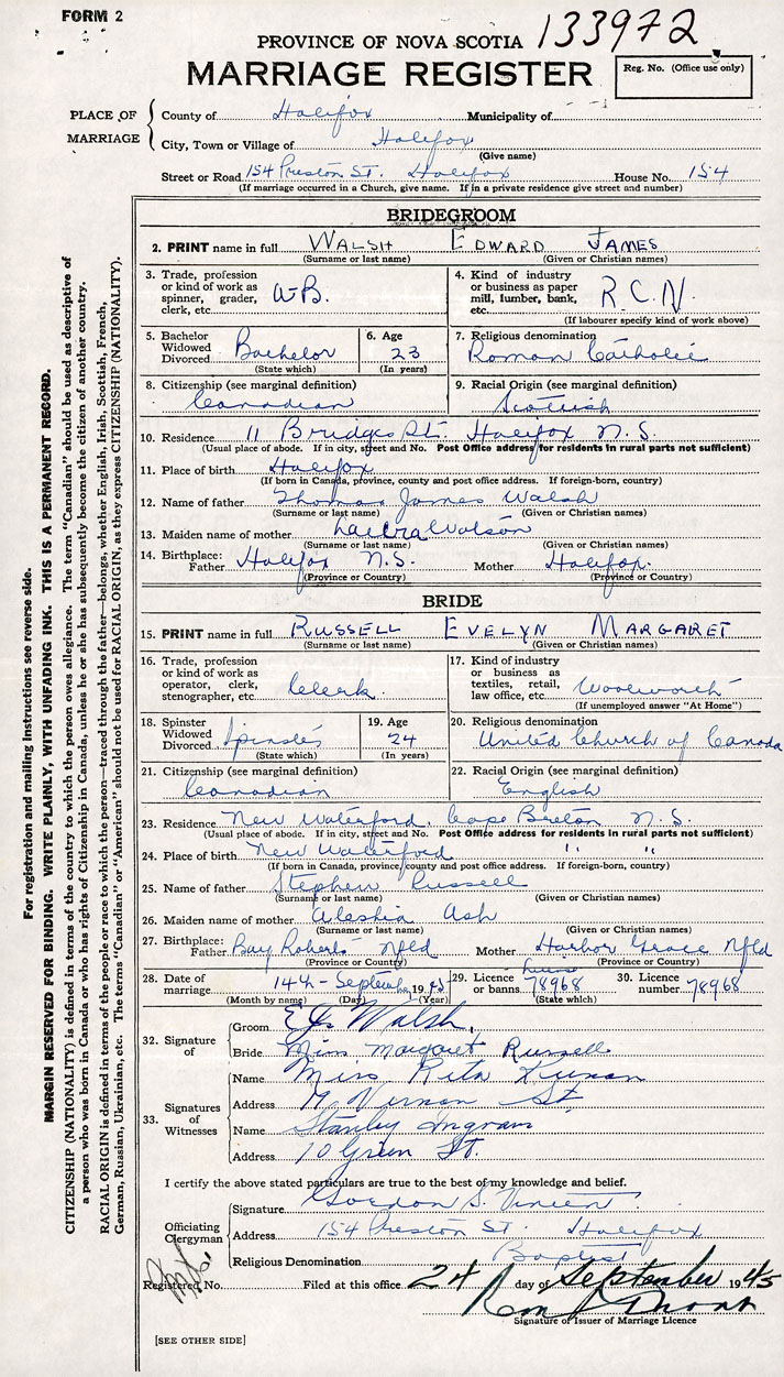 26. Place of marriage 154 Preston Street Halifax, Halifax County