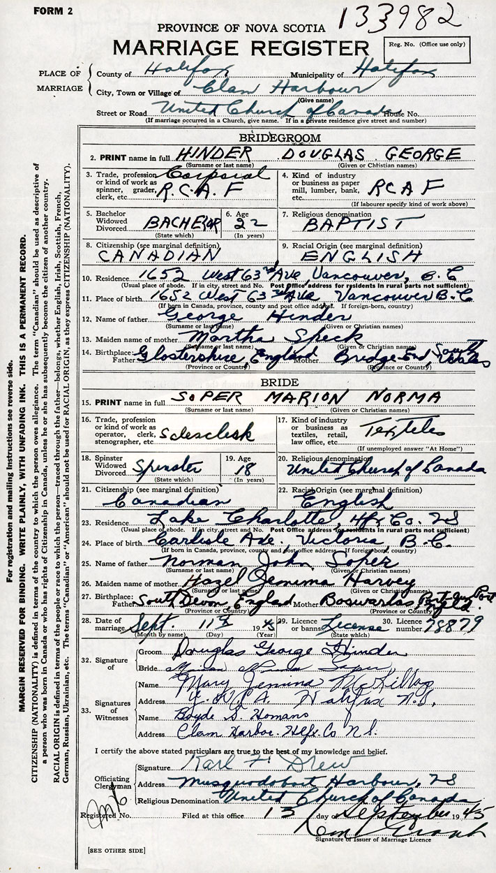 PLACE OF MARRIAGE County of Halifax in City or Town Clam Harbour
