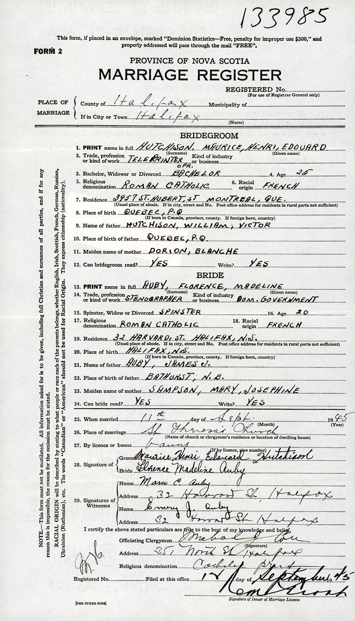 PLACE OF MARRIAGE County of Halifax in City or Town Halifax