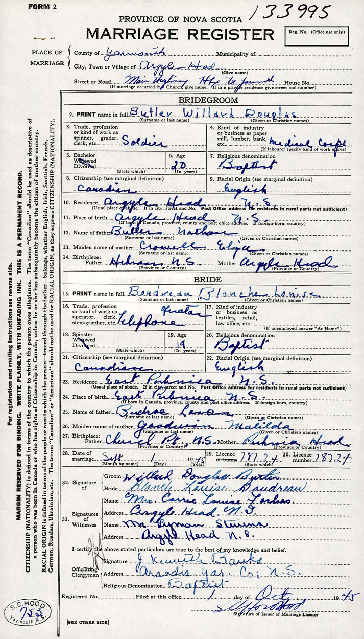 PLACE OF MARRIAGE County of Yarmouth in City or Town Argyle Head