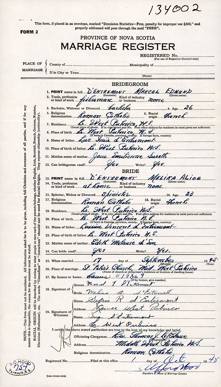 1. PRINT name in full D'Entremont, Marcel Edmund