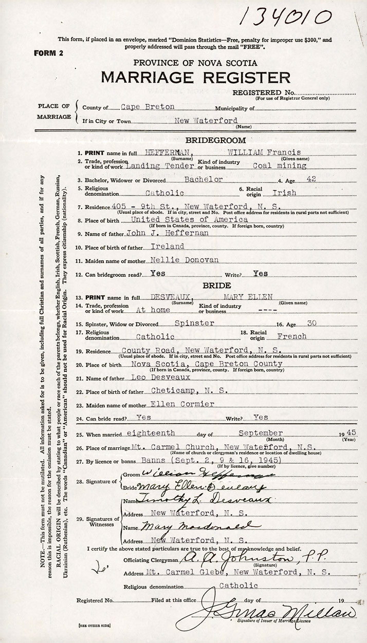 26. Place of marriage Mt. Carmel Church New Waterford, Cape Breton County