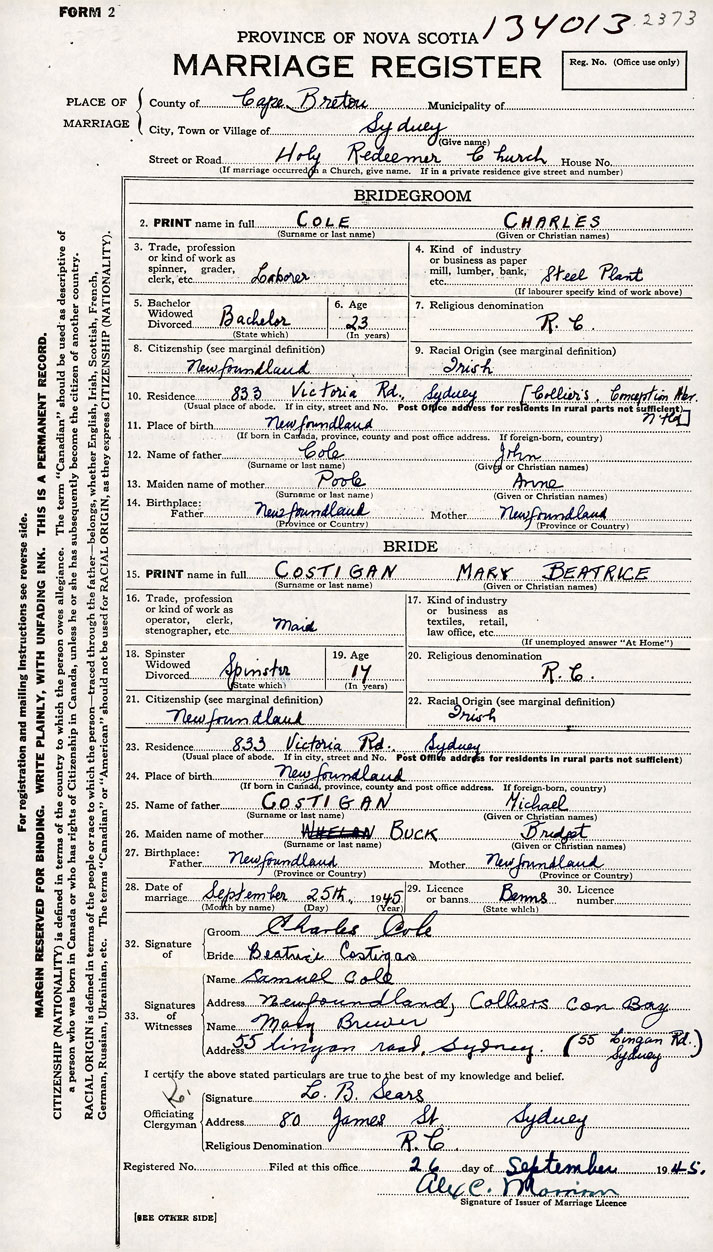 26. Place of marriage Holy Redeemer Church Sydney, Cape Breton County