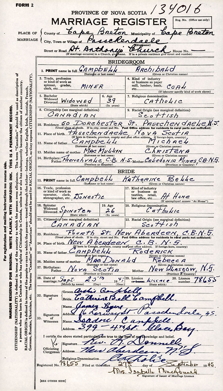 26. Place of marriage New Aberdeen, Cape Breton County