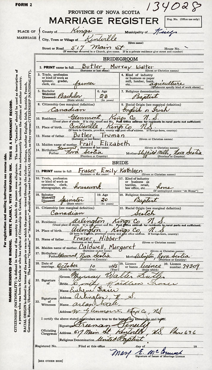 26. Place of marriage 517 Main St. Kentville, Kings County
