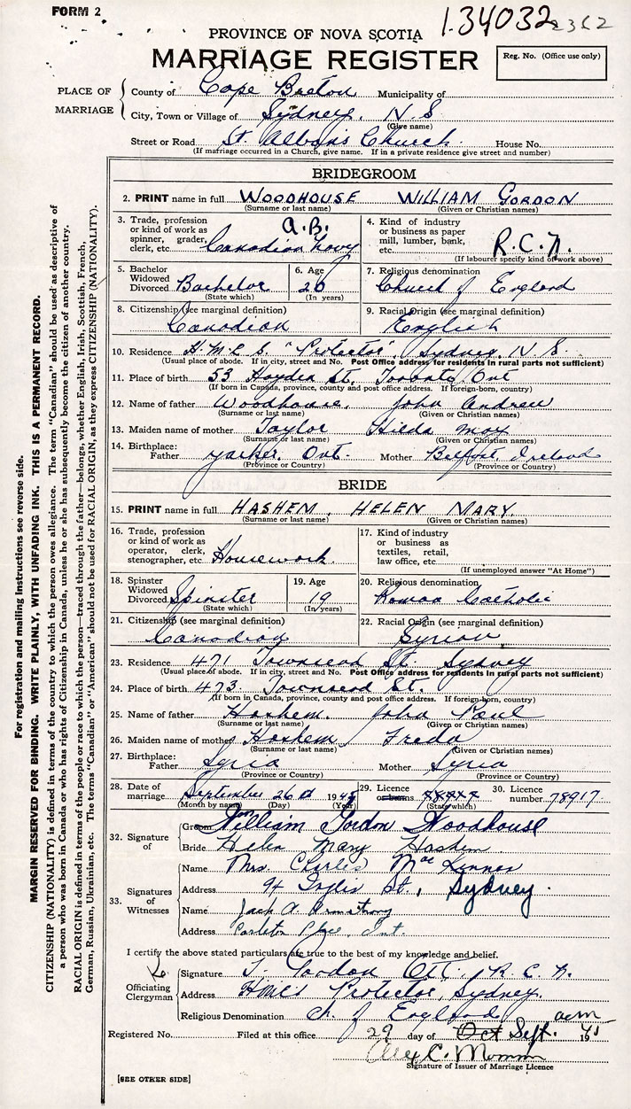 PLACE OF MARRIAGE County of Cape Breton in City or Town Sydney