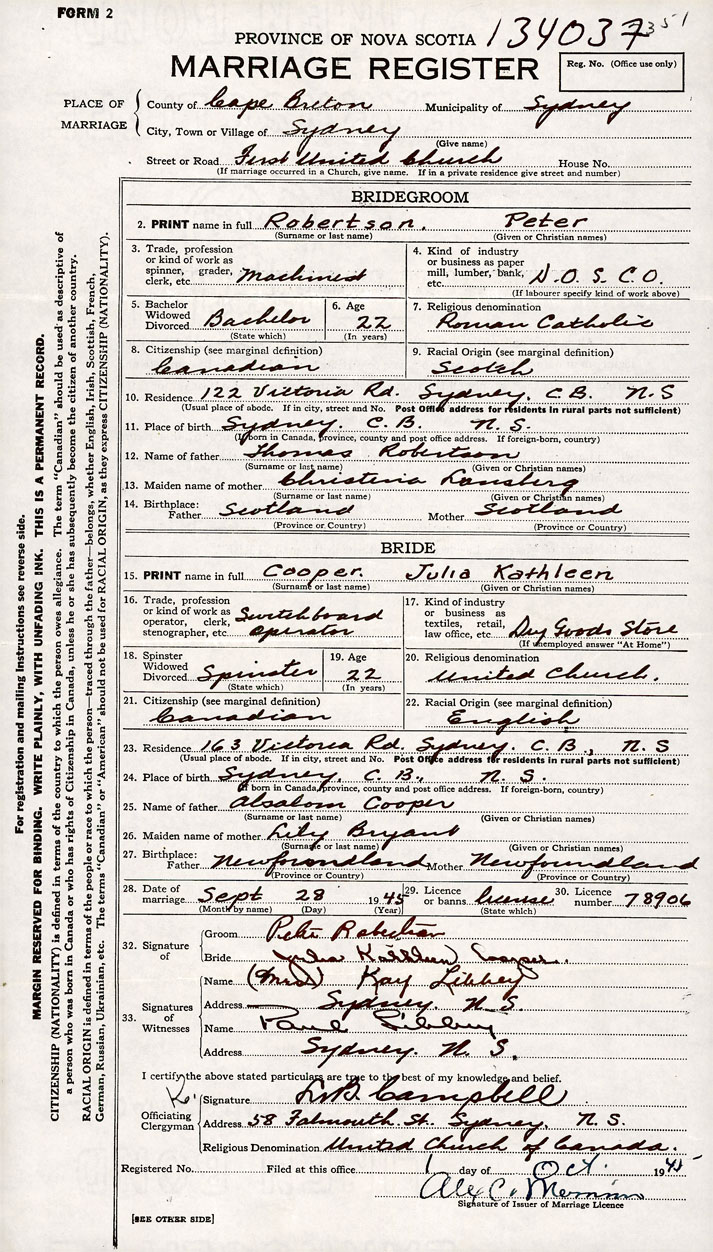 PLACE OF MARRIAGE County of Cape Breton in City or Town Sydney