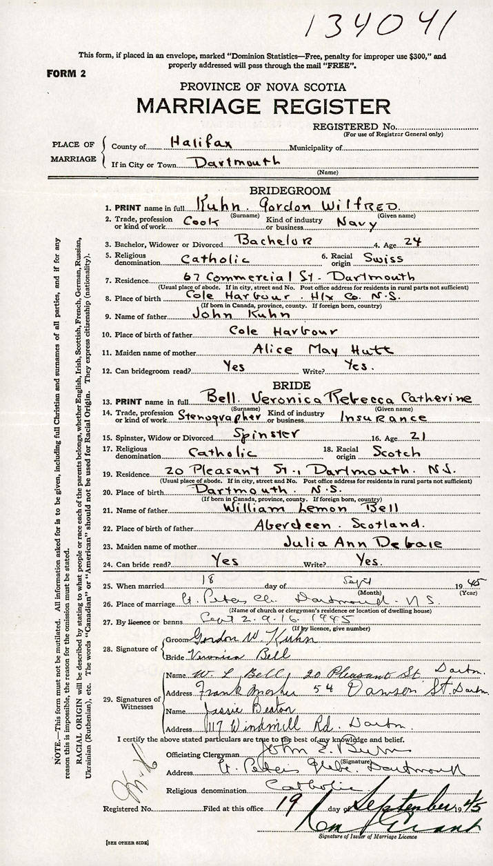 PLACE OF MARRIAGE County of Halifax in City or Town Dartmouth