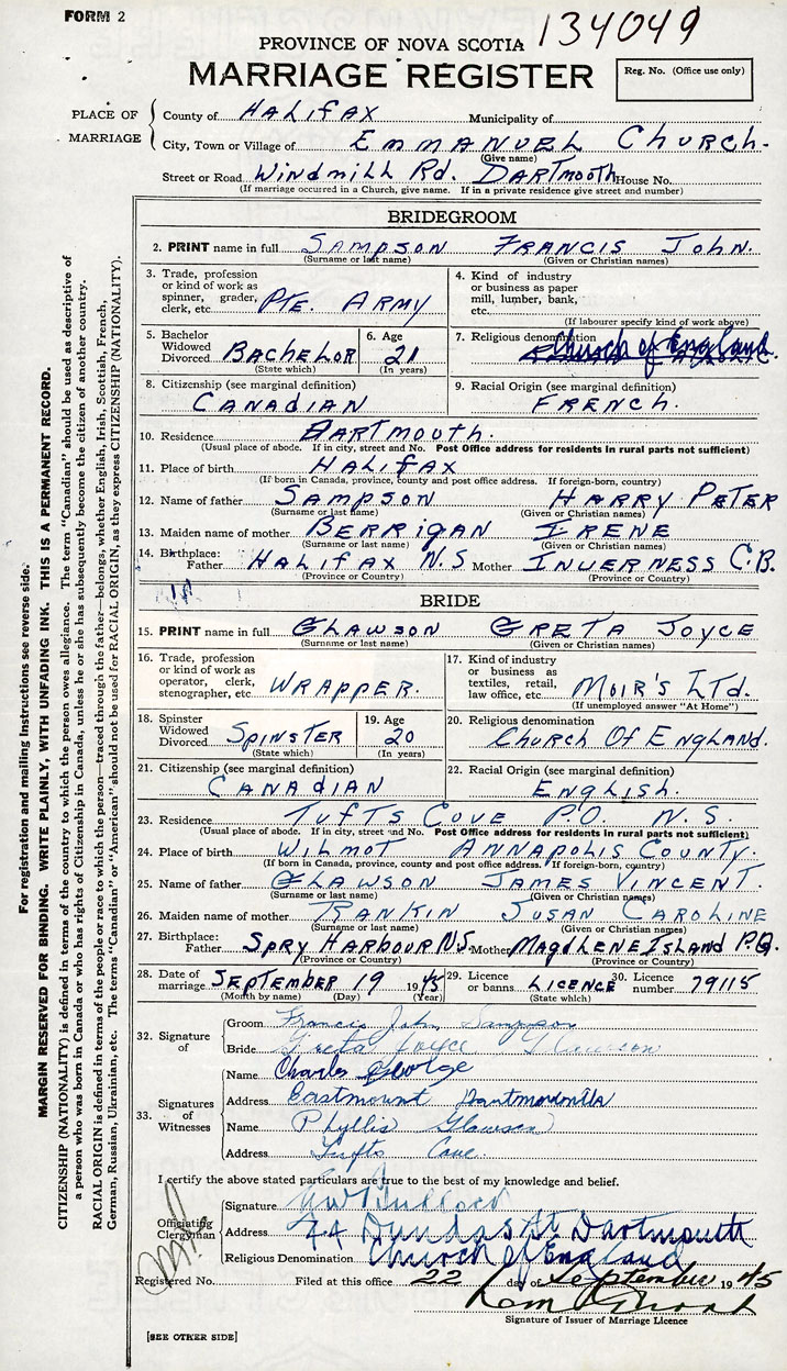 PLACE OF MARRIAGE County of Halifax in City or Town Dartmouth