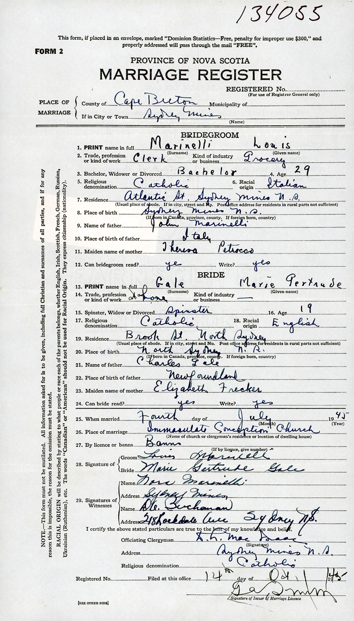 26. Place of marriage Immaculate Conception Church Sydney Mines, Cape Breton County
