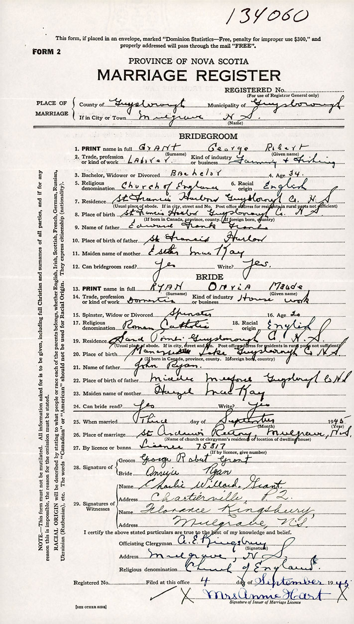 PLACE OF MARRIAGE County of Guysborough in City or Town Mulgrave