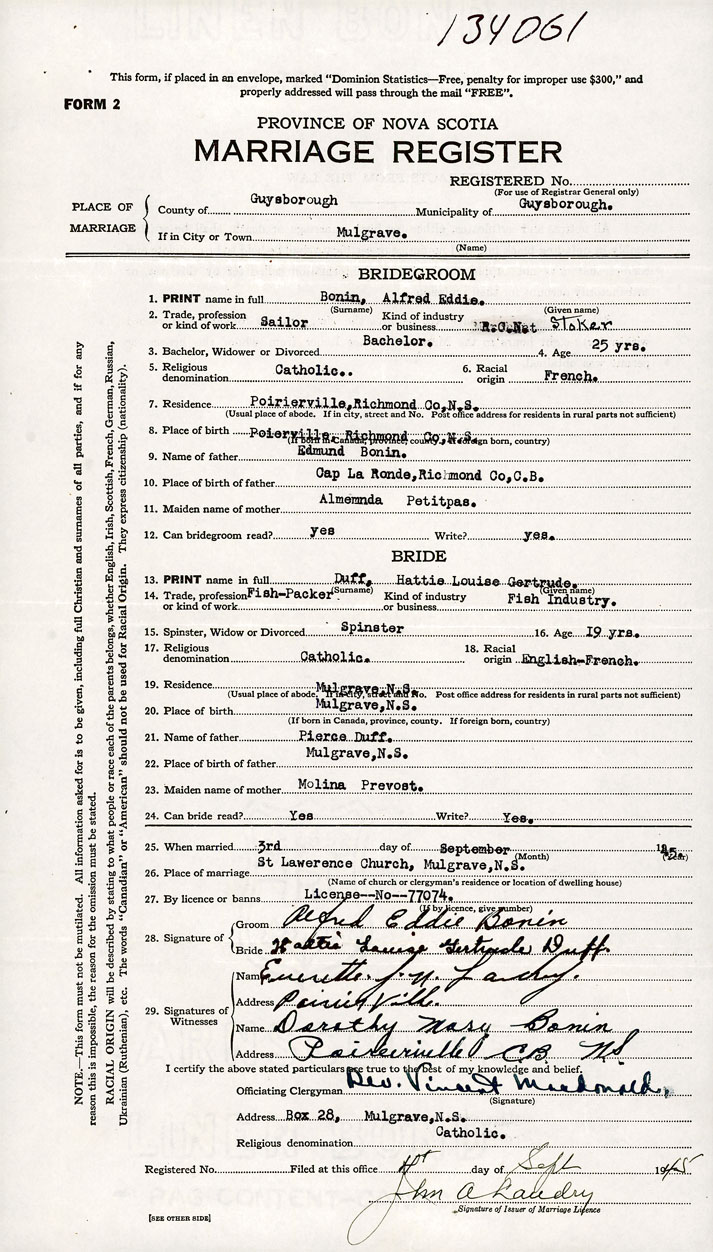 PLACE OF MARRIAGE County of Guysborough in City or Town Mulgrave