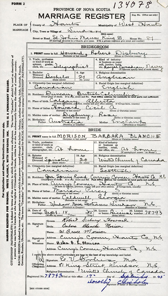 PLACE OF MARRIAGE County of Hants in City or Town Windsor