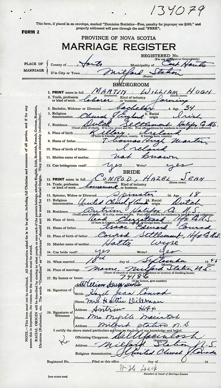 According to a certified copy of the Decree Absolute for Divorce dated 1963-5-10 and filed in the Office of the Registrar General under Divorce number 63-001218, it is ordered that the marriage of William Hugh Martin and Hazel Jean Conrod (Registered under marriage number 1945-13479) be null and void.