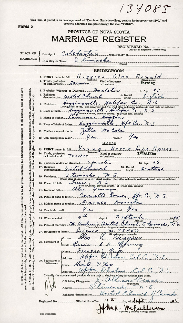 26. Place of marriage St. Andrew's United Church Stewiacke, Colchester County