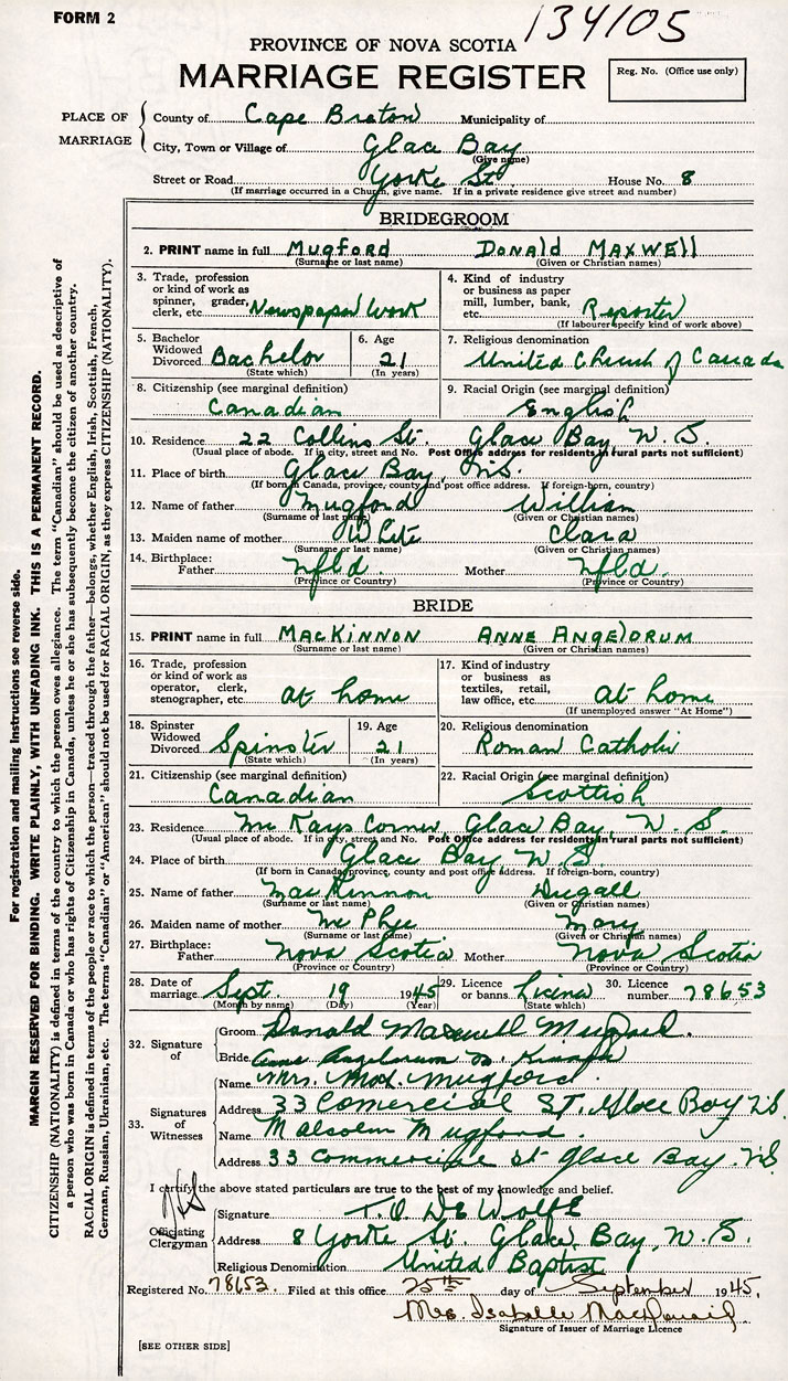 26. Place of marriage 8 York Street Glace Bay, Cape Breton County