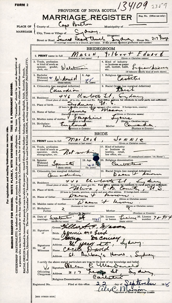 PLACE OF MARRIAGE County of Cape Breton in City or Town Sydney