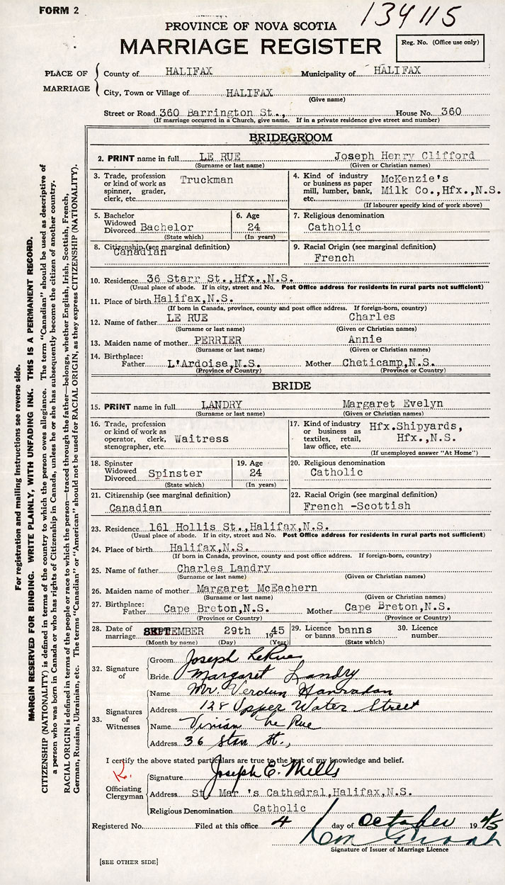 PLACE OF MARRIAGE County of Halifax in City or Town Halifax