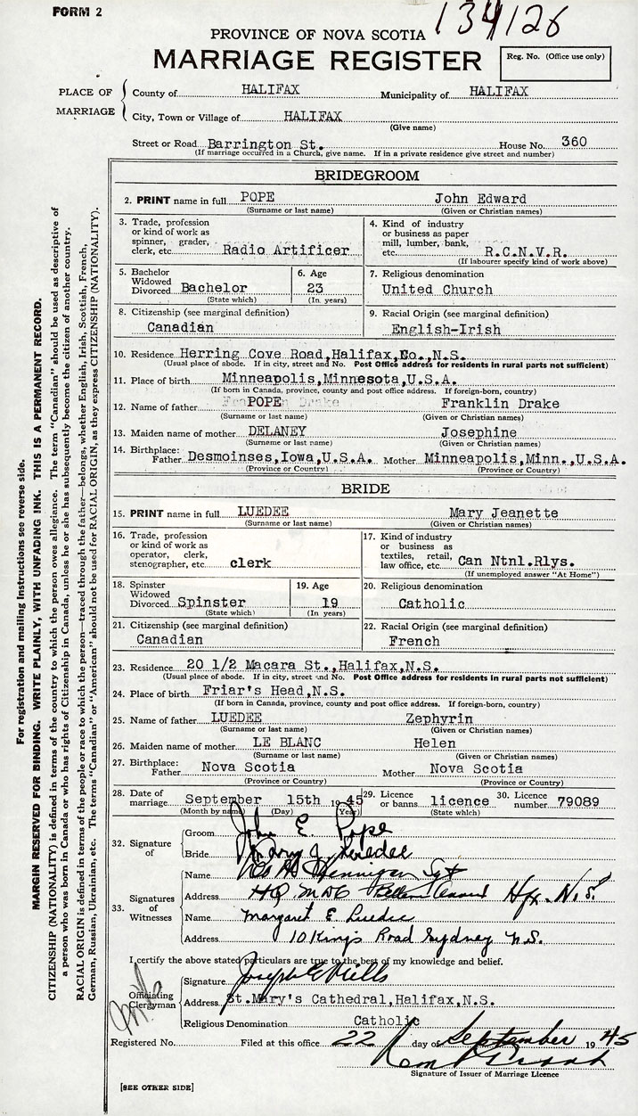 26. Place of marriage 360 Barrington Street Halifax, Halifax County