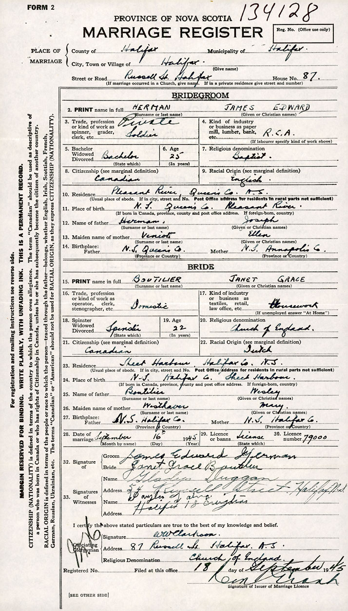 26. Place of marriage 87 Russell St Halifax, Halifax County