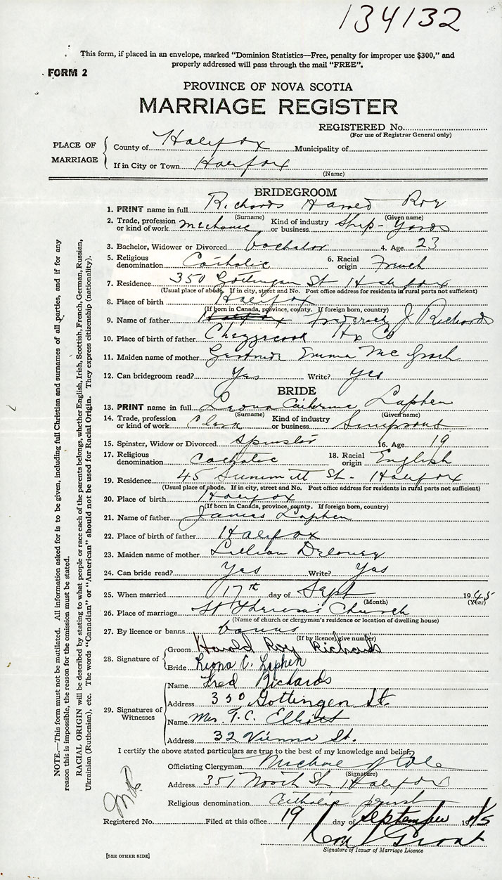 PLACE OF MARRIAGE County of Halifax in City or Town Halifax