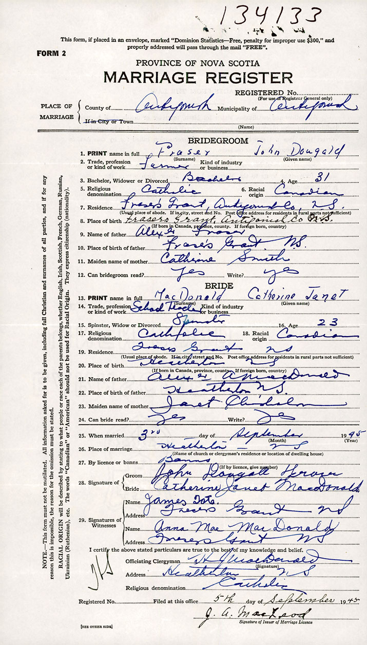 8. Place of birth Fraser’s Grant, Antigonish County NS