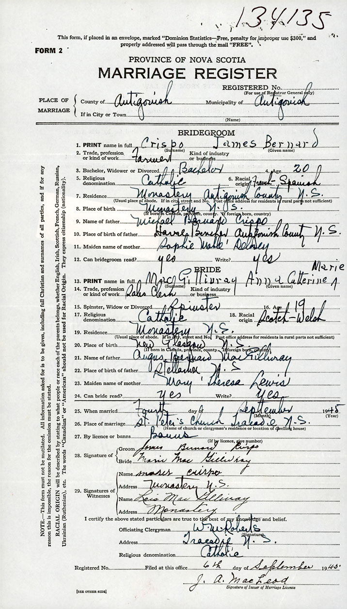 PLACE OF MARRIAGE County of Antigonish in City or Town Tracadie