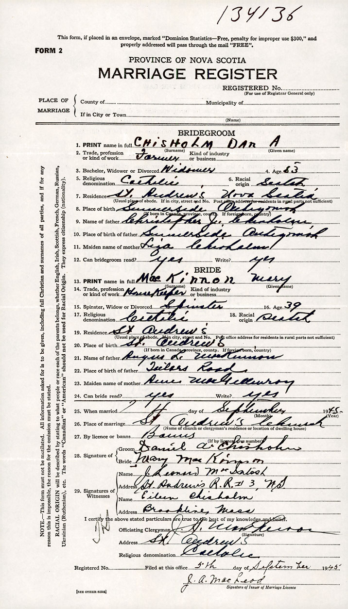 26. Place of marriage St. Andrew's Church St. Andrews, Antigonish County