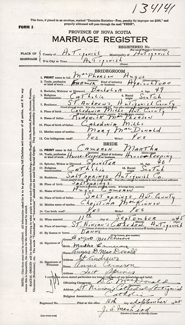 PLACE OF MARRIAGE County of Antigonish in City or Town Antigonish