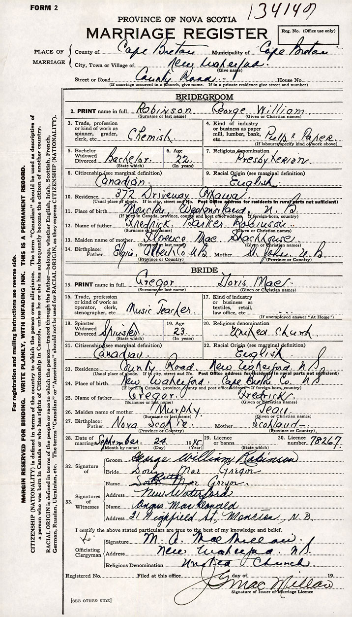 26. Place of marriage County Road New Waterford, Cape Breton County