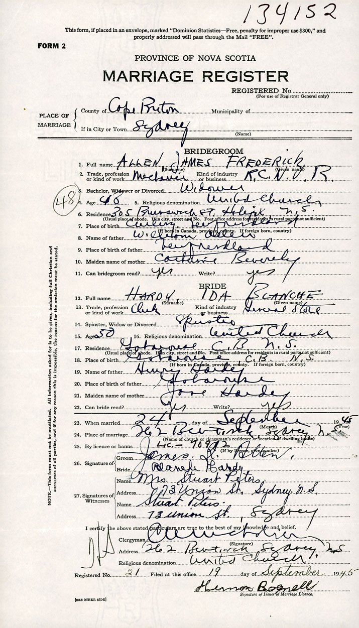 26. Place of marriage 262 Bentinck St. Sydney, Cape Breton County