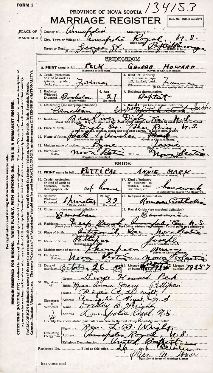 PLACE OF MARRIAGE County of Annapolis in City or Town Annapolis Royal